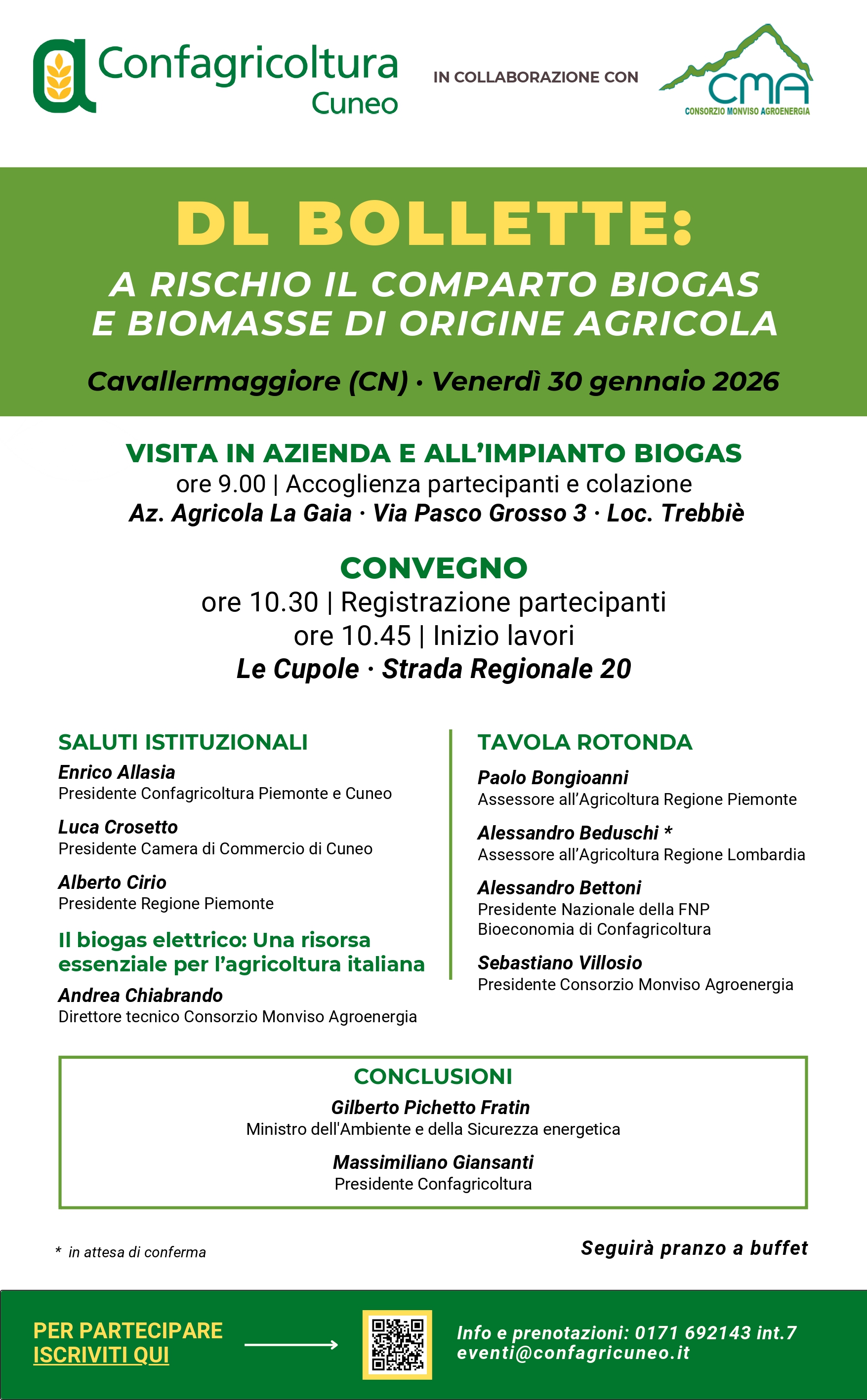 Confagricoltura, a livello nazionale, già a dicembre si è rivolta al ministro dell’Ambiente e della Sicurezza energetica, Gilberto Pichetto Fratin, per chiedere una profonda revisione della norma. Il ministro e Giansanti saranno protagonisti nelle conclusioni del convegno “DL Bollette. A rischio il comparto biogas e biomasse di origine agricola”, che si terrà a Cavallermaggiore, a Le Cupole, organizzato da Confagricoltura in collaborazione con il Consorzio Monviso Agroenergia. Dopo i saluti istituzionali di Enrico Allasia, presidente di Confagricoltura Cuneo e Piemonte, Luca Crosetto, presidente della Camera di commercio di Cuneo, e Alberto Cirio, presidente della Regione Piemonte, è in programma una tavola rotonda: i relatori previsti sono Sebastiano Villosio, presidente del Consorzio Monviso Agroenergia, Alessandro Bettoni, presidente della FNP (federazione nazionale di prodotto) Bioeconomia di Confagricoltura, e gli assessori regionali all’Agricoltura del Piemonte, Paolo Bongioanni, e della Lombardia, Alessandro Beduschi.